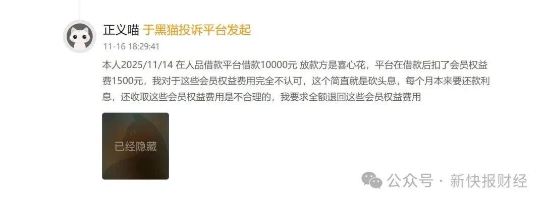 另有用户称,在人品借款平台贷款,平台匹配一个叫花花卡随你花的产品,借款8000元扣取了1758元;在人品借款平台借款10000元,放款方是喜心花,平台在借款后扣了会员权益费1500元。这些用户亦认为,相关会员权益费用属于砍头息。