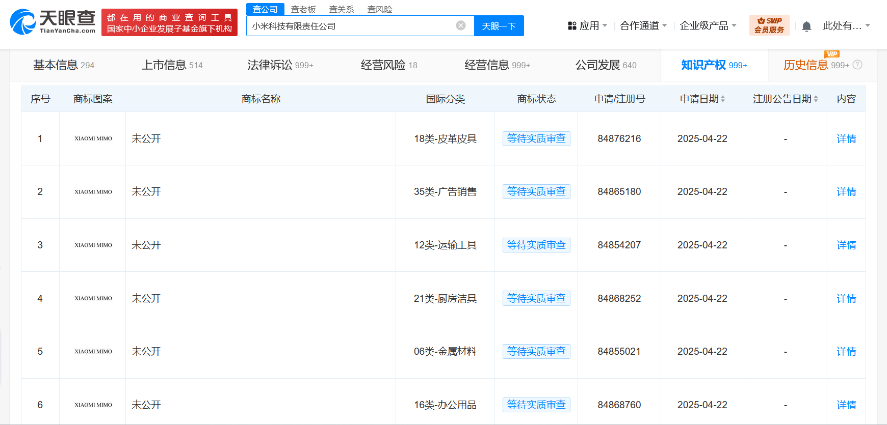 天眼查App显示,近日,小米科技有限责任公司申请注册多枚“XIAOMI MIMO”商标,国际分类为运输工具、科学仪器、通讯服务等,当前商标状态均为等待实质审查。
