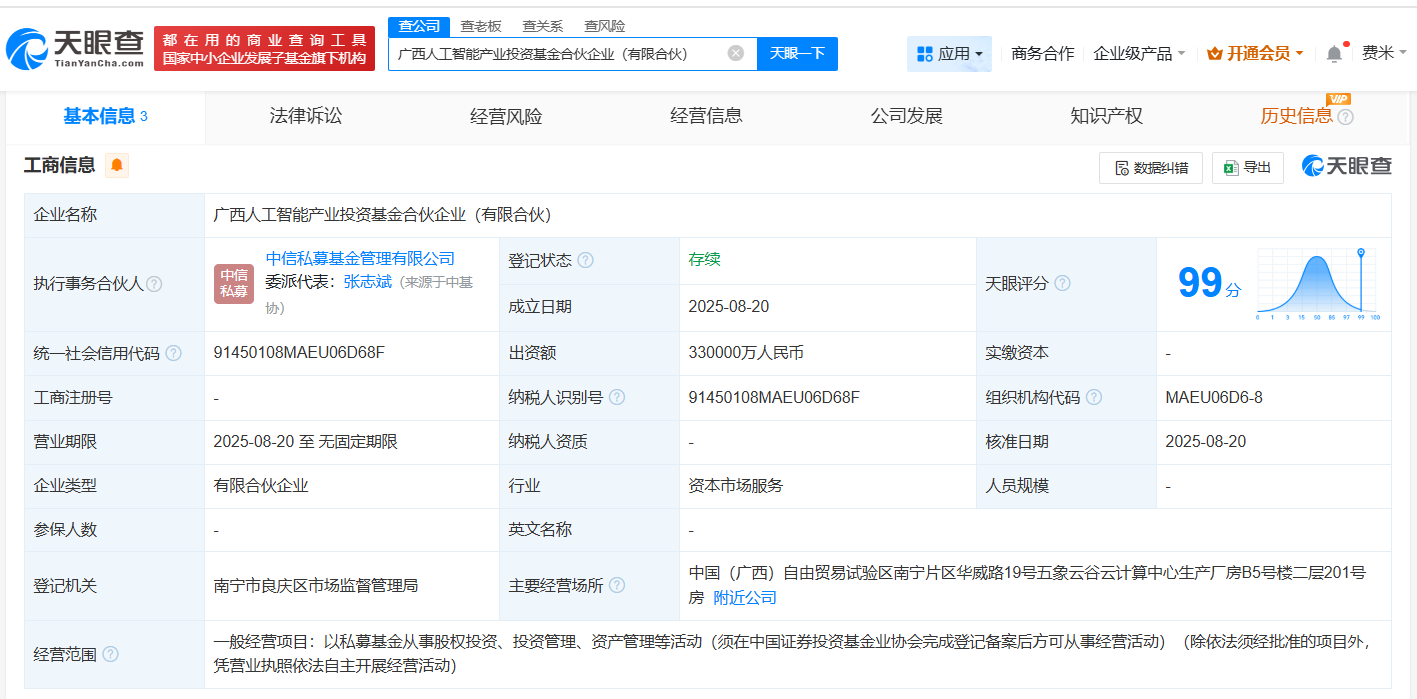 天眼查工商信息显示,近日,广西人工智能产业投资基金合伙企业(有限合伙)成立,执行事务合伙人为中信私募基金管理有限公司,出资额33亿人民币,经营范围为以私募基金从事股权投资、投资管理、资产管理等活动。