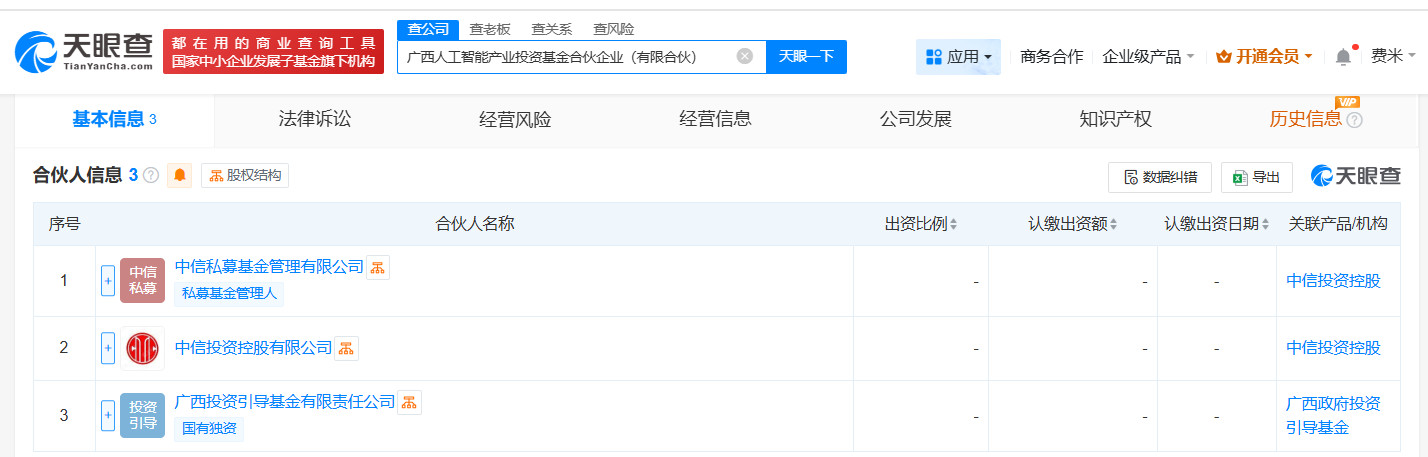 天眼查工商信息显示,近日,广西人工智能产业投资基金合伙企业(有限合伙)成立,执行事务合伙人为中信私募基金管理有限公司,出资额33亿人民币,经营范围为以私募基金从事股权投资、投资管理、资产管理等活动。合伙人信息显示,该基金由中信私募基金管理有限公司、中信投资控股有限公司、广西投资引导基金有限责任公司共同出资。