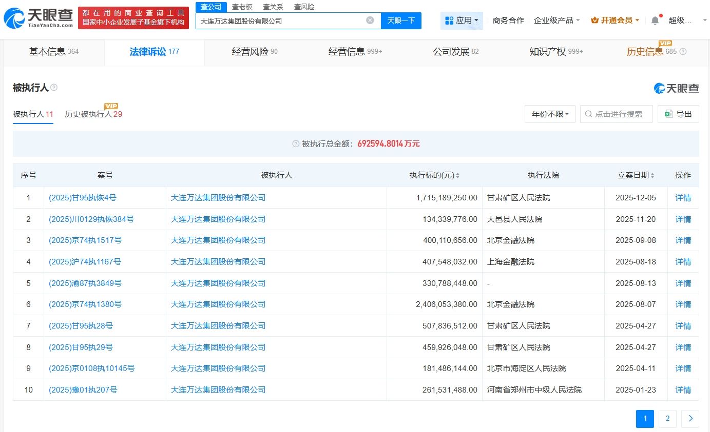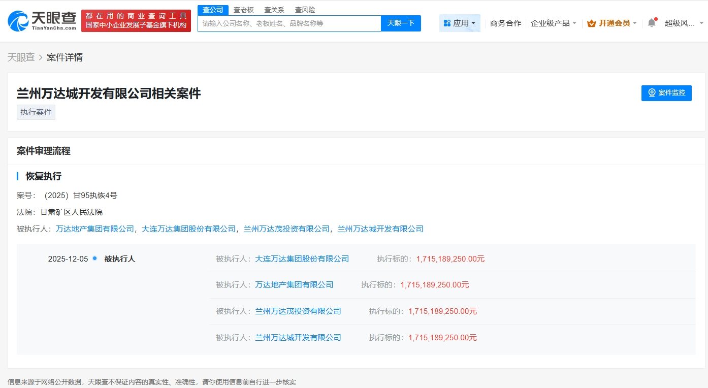 天眼查天眼风险信息显示,近日,大连万达集团股份有限公司、万达地产集团有限公司等新增1条恢复执行信息,执行标的17亿余元,执行法院为甘肃矿区人民法院。