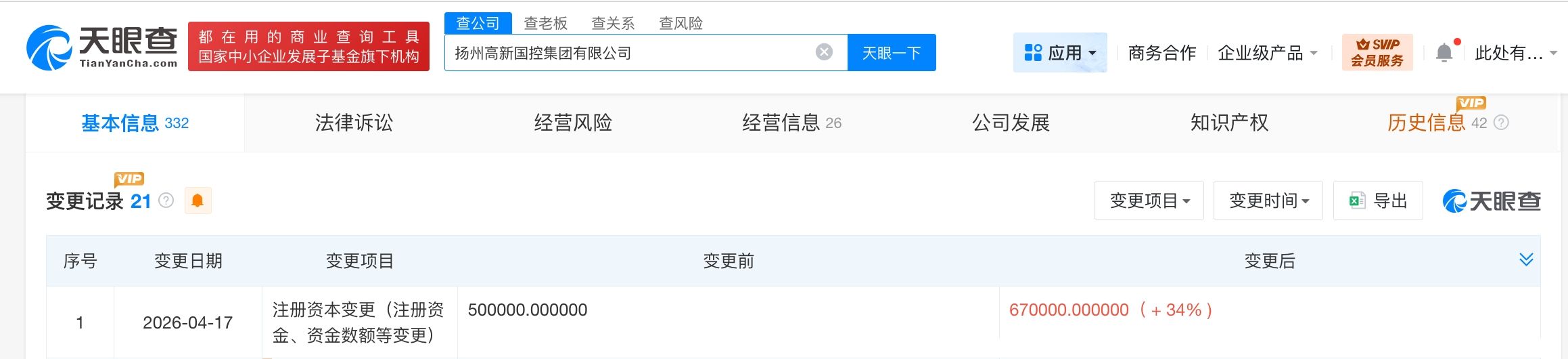 天眼查App显示,近日,扬州高新国控集团有限公司发生工商变更,注册资本由50亿人民币增至67亿人民币,增幅34%。