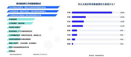 【TechWeb】9月6日消息,近日,职场社交平台脉脉发布《互联网新人职业选择报告2021》,对于工作1-3年的互联网人才在就业选择上的现状进行梳理和分析。报告显示,互联网新人更看重成长空间,包括独立带项目的机会,以及包容性和创新等等。职场文化价值观方面,“平等”以42%的得票率排名第一,遥遥领先,开放、专业排在其次。