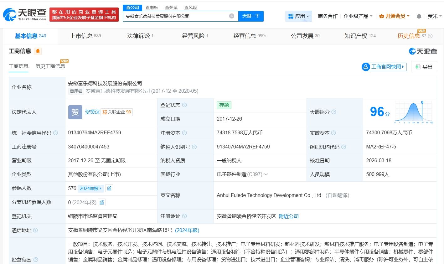 天眼查App显示,近日,富乐德(301297)发生工商变更,注册资本由约3.4亿人民币增至约7.4亿人民币,增幅约120%。