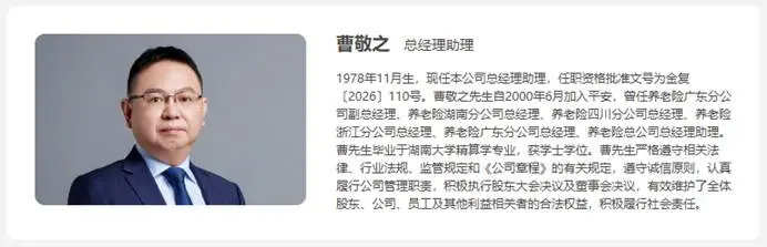 公开资料显示,曹敬之出生于1978年11月,自2000年6月加入平安,曾任养老险广东分公司副总经理、养老险湖南分公司总经理、养老险四川分公司总经理、养老险浙江分公司总经理、养老险广东分公司总经理、养老险总公司总经理助理。曹先生毕业于湖南大学精算学专业,获学士学位。