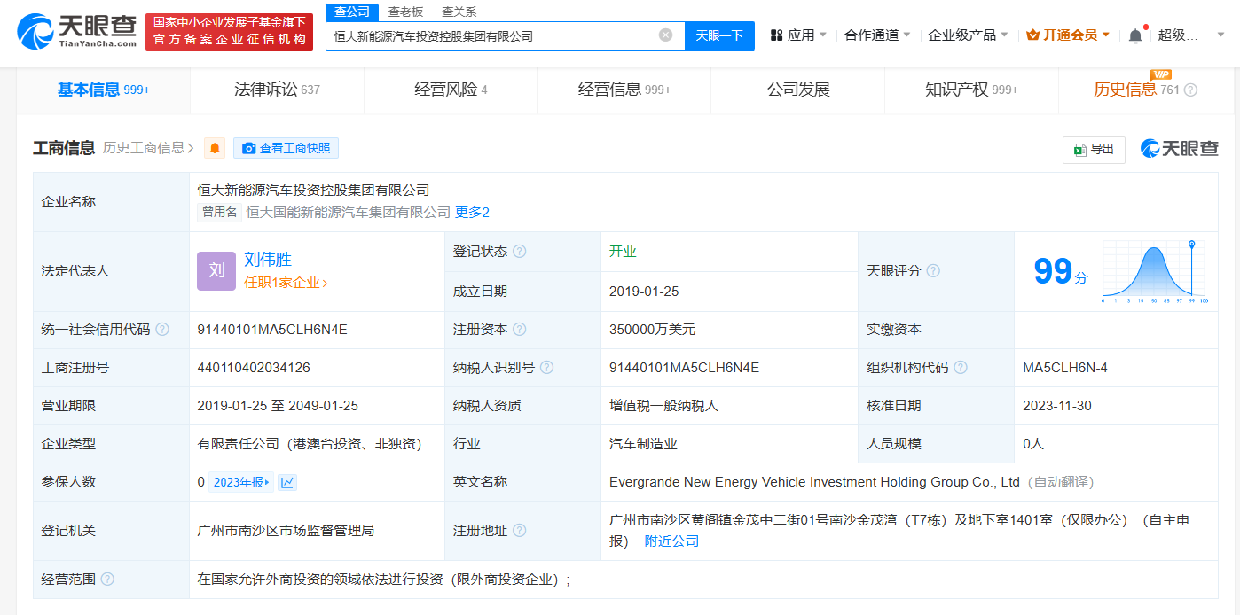 恒大新能源汽车投资控股集团有限公司成立于2019年1月,法定代表人为刘伟胜,注册资本35亿美元,由恒大新能源汽车控股(香港)有限公司、恒大恒驰新能源汽车(广东)有限公司共同持股。天眼风险信息显示,该公司现存60余条被执行人信息,被执行总金额超23.35亿元,此外还存在多条限制消费令、失信被执行人(老赖)和终本案件信息。