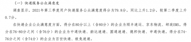 相反,通达系则更多的是为电商平台的商家服务,更低的价格是竞争核心,而服务质量并不是它们所关心的,只要保证买家能收到货就行。从国家邮政局公布的快递企业满意度评分也能够看出,三季度通达系的得分没有一家在80分以上。
