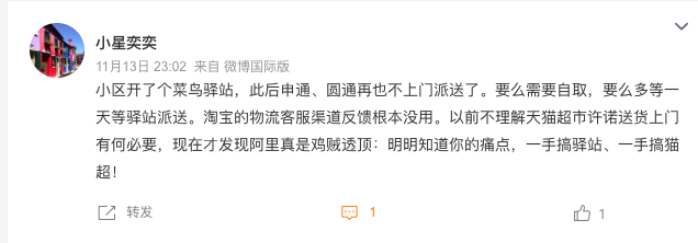 此外,在微博等社交平台上,也不乏网友关于快递不上门的吐槽,“小区开了个菜鸟驿站,此后申通、圆通再也不上门派送了。要么需要自取,要么多等一天等驿站派送。”