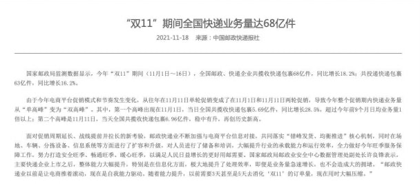 据国家邮政局监测数据显示,今年“双11”期间(11月1日~16日),全国邮政、快递企业共揽收快递包裹68亿件,同比增长18.2%;共投递快递包裹63亿件,同比增长16.2%。由于双11变成了“双节棍”,今年整个促销期内快递业务量从“单高峰”变为“双高峰”。