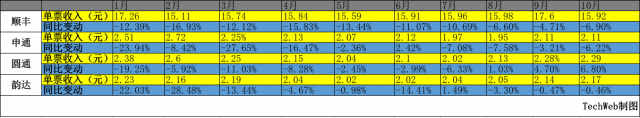 从公开的财报数据显示,各家快递公司在实现营收、快递单量增长的同时,单票价格却同比去年同期有着不同程度的下滑。从整理的表格数据来看,即便是顺丰,也避免不了这尴尬的情况,在今年某些月份的单价同比下滑更是超过了10%。