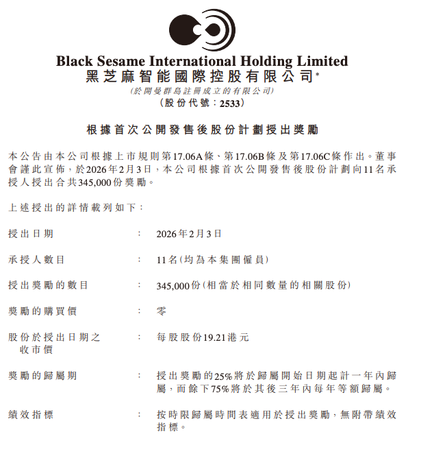 【TechWeb】2月4日消息,黑芝麻智能昨日晚间发布公告,宣布根据其首次公开发售后股份计划,向11名集团雇员授出合共345,000份奖励,相当于同等数量的股份。
