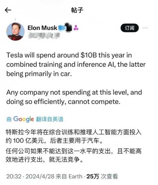 4月28日,身在中国的马斯克在X上发文,特斯拉今年将在综合训练和推理人工智能方面投入约100亿美元,后者主要用于汽车。
