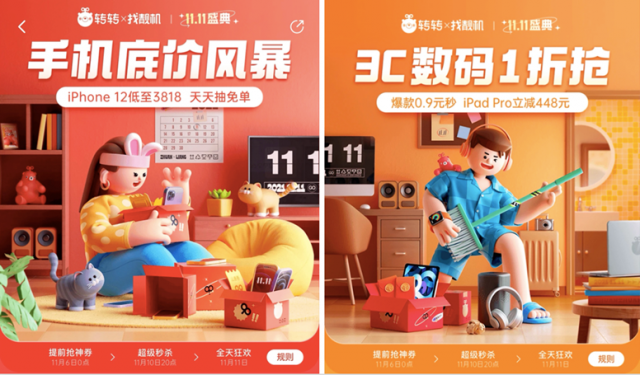 据了解,今年双11转转集团旗下转转和找靓机两大平台再次推出二手双11大促盛典,手机数码等商品“抢底价”,为用户带来真实惠的同时也给今年的双11带来不一样的注解。
