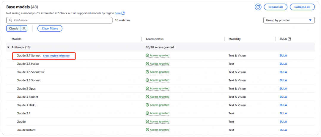 在Amazon Bedrock控制台中请求访问权限。在导航窗格中,选择模型访问。然后,修改模型访问以请求访问Claude 3.7 Sonnet。