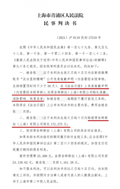 特斯拉“车顶维权”女车主一审被判公开致歉