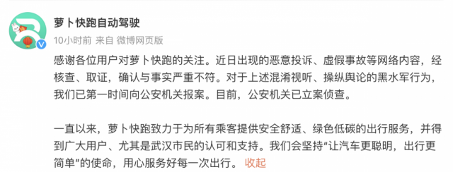 对此,萝卜快跑在官方微博回应称,近日出现的恶意投诉、虚假事故等网络内容,经核查、取证,确认与事实严重不符。对于上述混淆视听、操纵舆论的黑水军行为,我们已第一时间向公安机关报案。>> 点击查看详情