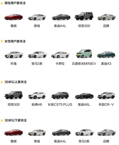 随着中国车市进入存量竞争时代,各大车企开启性别、年龄等细分领域角逐。报告显示,在车型关注重点上,男性注重创新,对坦克300等新车兴趣浓厚;女性偏爱颜值,对五菱宏光MINI EV、奥迪A3等小尺寸汽车格外喜欢。从年龄来看,30岁以下用户“种草”的车型设计更时尚前卫,如奥迪A4L、宝马3系等;30岁以上更看重实用性,哈弗H6、长安CS75 PLUS等实用型和奥迪A6L等商务车型位列其中。