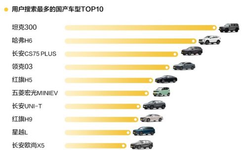 与此同时,国产车的创新力和性价比被广泛认可,长安、比亚迪、吉利等自主品牌冲入品牌搜索Top10,坦克300、哈弗H6、五菱宏光MINI EV等“国产神车”,在车型关注度排行榜中位居前列。