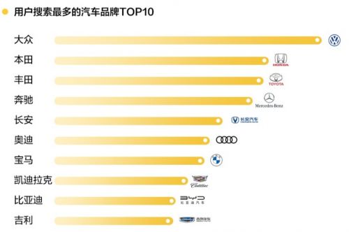 2021年用户搜索最多的汽车品牌Top10中,2021年懂车帝汽车品牌搜索Top10中,没有新能源汽车品牌。