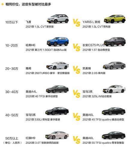 报告分析懂车帝车型库中相同价位被对比最多的车型发现,在10万以内区间,本田飞度、丰田致炫同台PK次数最多;在10万-20万区间,国产SUV销量王哈弗H6的最大对手是长安CS75 PLUS。在20万、30万、40万等不同价位区间,雅阁与凯美瑞、奥迪A4L和宝马3系、宝马5系及奥迪A6L成为劲敌。