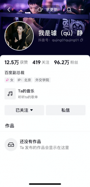 百度副总裁璩静已经删除了个人抖音号上所有视频内容,在今早就已被删除,该号粉丝数已经达到96.2万。