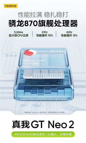 其他方面,根据此前曝光的消息,全新的realme GT Neo2将采用一块6.62英寸单孔AMOLED屏幕,将搭载骁龙870次旗舰芯片,最高会配备12GB+512GB超大存储组合,能提供非常强劲的性能保障,对于长时间的性能输出也会更加持久。后置6400万像素+800万像素+200万像素组成的三摄相机模组,前置摄像头为1600万像素。此外,该机还将搭载全新的散热系统,能够将骁龙870的旗舰性能充分释放,官方称其散热表现达到了天花板级别。