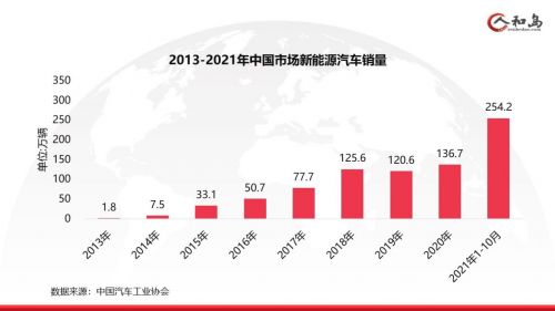 新能源市场从2013年的1.8万辆直接干到了2021年的300万辆(前10月累计销量为254万辆,2021年300万辆可以说是板上钉钉的。)如果有人在2014年预判未来5年新能源市场规模将超越200万辆,很大可能被认为是天方夜谭,更不用说300万。