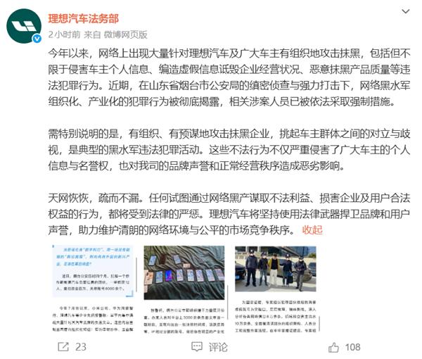 【TechWeb】理想汽车法务部今日转发烟台公安通报,称今年以来网络上出现大量针对理想汽车及车主的有组织攻击抹黑行为,包括侵害车主个人信息、编造虚假信息诋毁企业经营状况、恶意抹黑产品质量等违法犯罪活动。烟台市公安局近期通过缜密侦查与强力打击,彻底揭露了这一网络黑水军组织化、产业化的犯罪行为,相关涉案人员已被依法采取强制措施。