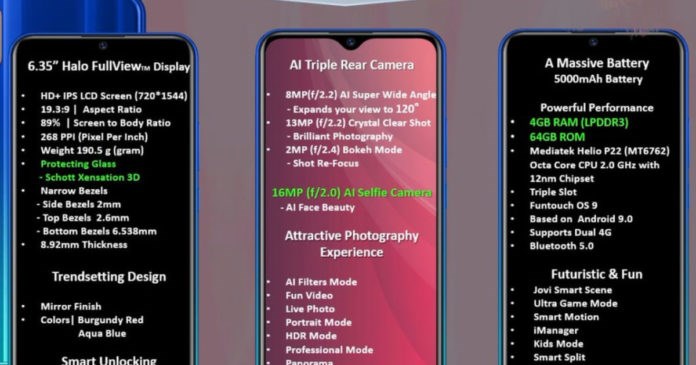根据Mahesh电信的报道,vivo Y12和vivo Y15智能手机都将配备6.35英寸HD+ Halo全视屏,分辨率为1544 x 720像素,屏占比为89%,像素密度为268ppi。将搭载联发科Helio P22处理器,内存规格为3GB/4GB,存储空间为32GB/64GB。有一个microSD卡插槽,以帮助提升存储扩展。