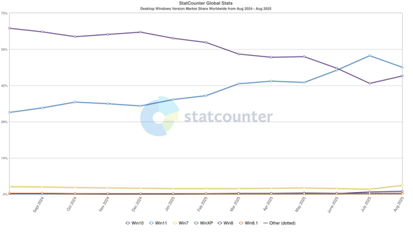 【TechWeb】随着2025年9月的到来,Statcounter发布了最新的全球Windows操作系统市场份额数据。数据显示,尽管Windows 11仍是全球最受欢迎的Windows版本,占据49.02%的市场份额,但其份额相比上月有所下降,减少了4.49个百分点。与此同时,Windows 10在市场份额上有所回升,目前以45.65%的份额位居第二,增长了2.77个百分点。