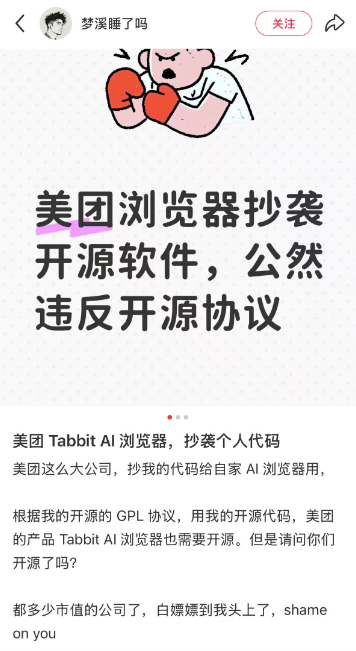 美团Tabbit AI浏览器被指抄袭个人代码 回应:已跟作者沟通项目License 正式授权快讯