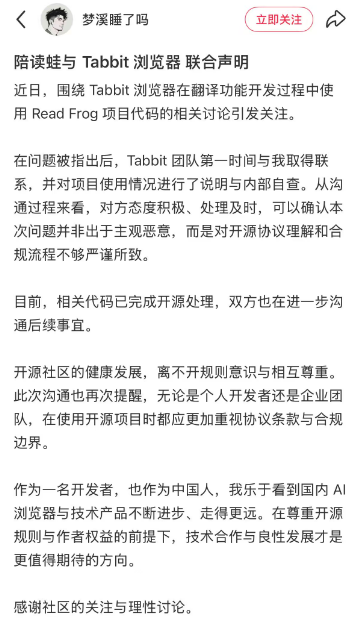 同时,独立开发者“梦溪睡了吗”也就此事发布声明:“在问题被指出后,Tabbit团队第一时间与我取得联系,并对项目使用情况进行了说明与内部自查。从沟通过程来看,对方态度积极、处理及时,可以确认本次问题并非出于主观恶意,而是对开源协议理解和合规流程不够严谨所致。