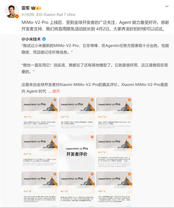 【TechWeb】在AI大模型赛道打得火热的当下,小米的入局姿态显得异常凶猛。近日,雷军亲自下场发声,宣布小米面向Agent时代的旗舰基座模型——MiMo-V2-Pro自上线以来,在全球开发者圈层引发了热烈反响,其核心的Agent能力更是收获了一致好评。为回馈这份热情,雷军拍板决定:将原定的首周限免活动正式延长至4月2日,并幽默地喊话开发者:“大家‘养龙虾’(注:业内对AI Agent的趣味代称)的时候可以试试。”