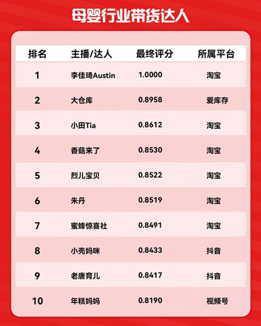榜单显示,爱库存店主“仓颉”入选服装内衣类top10榜单第五位,“周桐”入选鞋靴箱包类目第七位,“群群臻选”位列美妆个护类第九位,饷店小王子入选视频类第四位,大仓库位列母婴类第二位。