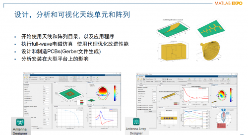 在设计天线阵列单元时,可以使用MathWorks提供的Antenna Toolbox。该工具箱使用矩量法 (MoM) 算法计算端口属性(如阻抗)、表面属性(如电流和电荷分布)以及电场属性(如近场和远场辐射方向图)。可以使用该工具箱以 2D 和 3D 形式可视化天线的几何结构和分析结果。也可将天线和阵列模型集成到无线系统中,并使用阻抗分析方法设计匹配网络。该工具箱还提供用于仿真波束成形算法的辐射方向图。