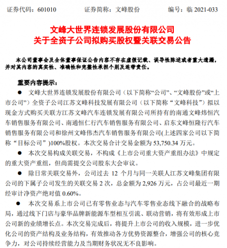 公告显示,文峰股份全资子公司江苏文峰科技发展有限公司(以下简称“文峰科技”)拟以现金方式购买关联方江苏文峰汽车连锁发展有限公司(以下简称“文峰汽车连锁”)所持有的南通文峰炜恒汽车销售服务有限公司(炜恒汽车)、南通恒仁行汽车销售服务有限公司(恒仁行汽车)、启东文峰恒隆行汽车销售服务有限公司(恒隆行汽车)和徐州文峰伟杰汽车销售服务有限公司(伟杰汽车)(上述四家公司以下简 称“目标公司”)100%股权。本次交易合计交易金额为 5.38亿元。