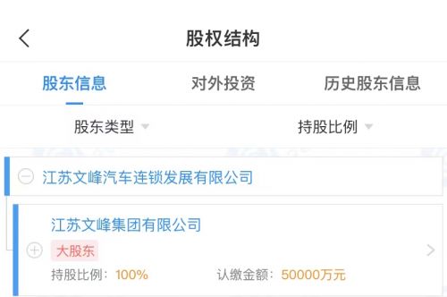 企查查APP显示,文峰汽车连锁由江苏文峰集团有限公司全资控股,而江苏文峰集团有限公司为上市公司文峰股份大股东,持股29.48%。