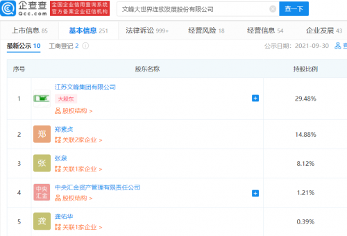 企查查APP显示,文峰股份(601010)成立于1995年9月,注册资本184800万元人民币,经营范围含餐饮服务等。截至2021年三季度末,徐翔母亲郑素贞,直接持有文峰股份2.75亿股股份,占上市公司总股本14.88%,位居公司第二大股东之列。