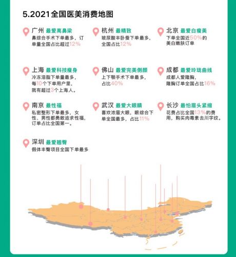 不同区域的医美消费也呈现出不同的特征。白皮书中“全国医美消费地图”显示,一线城市的消费更为精细化、对非手术项目也更为关注,例如北京最多美白嫩肤订单、上海下单最多冷冻溶脂项目。而新一线、二线城市则呈现出不同的地域特征,例如南京私密整形订单最多,长沙人下单了最多的肉毒毒素去川字纹等。