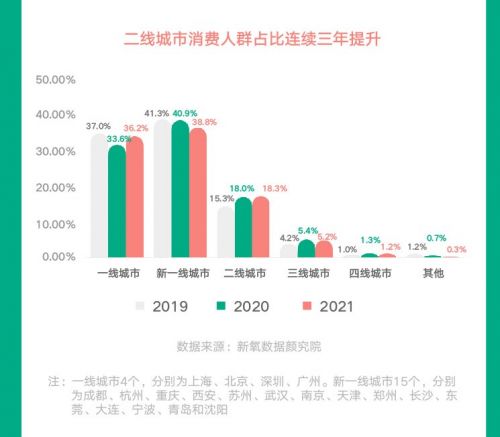 一线、新一线城市是医美消费主战场,医美消费人群占比70%以上,二线城市消费人群数量近三年来持续增长,至2021年,这一群体比例已经达到18.33%,与一线、新一线城市呈现三足鼎立之势。未来,二线城市有望成为医美市场新的增长极。