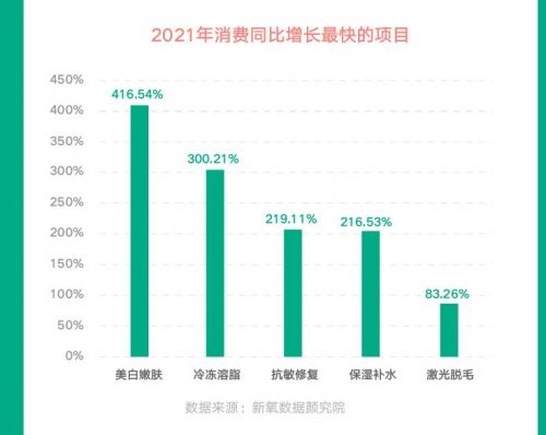 美白嫩肤、冷冻溶脂等项目,成为2021年消费增速最快的项目,同比增速分别高达416%、300%。身体塑形需求,也在逐渐走向精细化、非手术化,越来越多的人选择冷冻溶脂等非手术项目减脂。