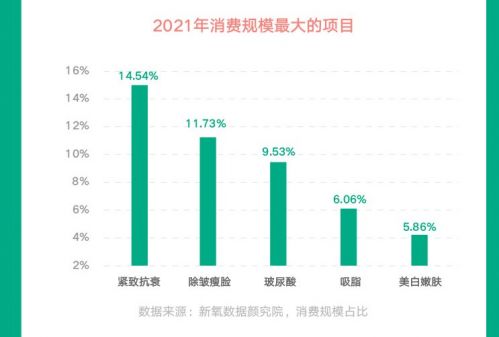 在具体消费项目上,非手术项目最受市场欢迎。2021年,消费规模占比最大的项目是紧致抗衰、除皱瘦脸、玻尿酸,在整体市场中占比14.55%、11.73%、9.53%。