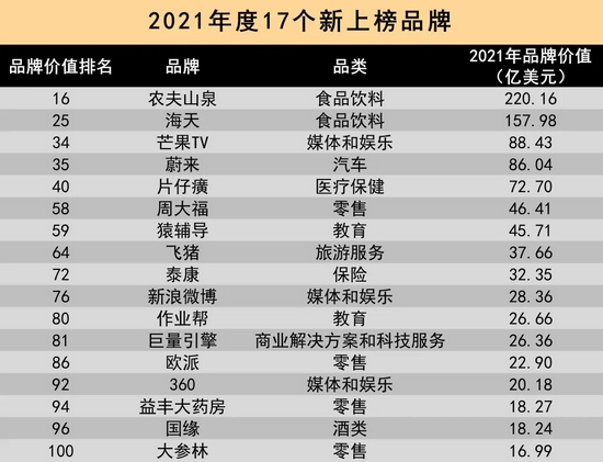 今年共有17个新上榜品牌,名列前茅的是食品饮料品牌农夫山泉(第16位,220亿美元)和海天(第25位,158亿美元),其它新上榜品牌还包括芒果TV(第34位,88亿美元)、新浪微博(第76位,28亿美元)、科技品牌360(第92位,20亿美元),以及四个零售品牌——周大福(第58位,46亿美元)、欧派(第86位,23亿美元)、益丰大药房(第94位,18亿美元)和大参林(第100位,17亿美元)。