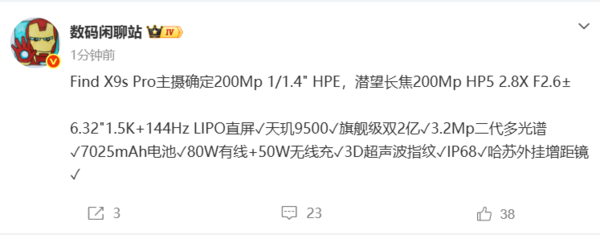 其他方面,影像方面也是OPPO Find X9s Pro的最大亮点,预计后置哈苏联合调校的三摄组合:主摄采用2亿像素三星HPE传感器(1/1.4英寸大底),潜望长焦为2亿像素三星HP5传感器(支持2.8倍光学变焦),并配备了一颗3.2MP的第二代多光谱传感器,以提升色彩还原准确性。并且还支持哈苏外挂增距镜,可进一步扩展远摄创作空间。此外,该机将内置7025mAh电池,支持80W有线闪充和50W无线闪充,还有望提供IP68级防尘防水等功能。