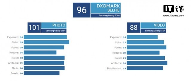 DxOMark最终给三星Galaxy S10+前置摄像头拍照打分101分,视频打分88分,综合分数为96分,位列DxOMark手机自拍榜单第一位。