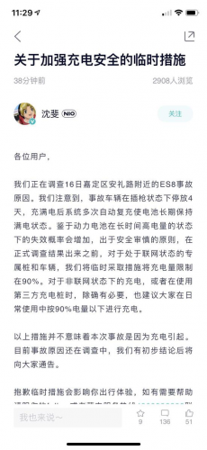 【TechWeb】蔚来汽车能源副总裁沈斐在蔚来App上发布《关于加强充电安全的临时措施》一文,表示事故车辆在插枪状态下停放4天,充满电后系统多次自动复充使电池长期保持满电状态,鉴于动力电池在长时间高电量的状态下的失效概率会增加,出于安全审慎的原则,在正式调查结果出来之前,对于处于联网状态的专属桩和车辆,蔚来将临时采取措施将充电量限制在90%。