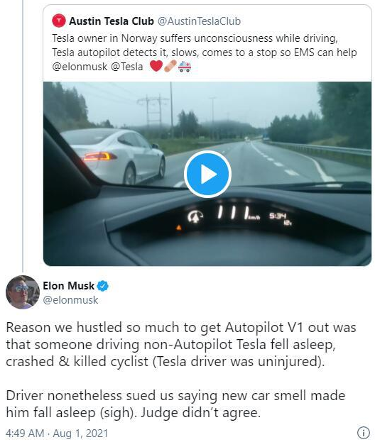 特斯拉CEO埃隆·马斯克(Elon Musk)也回应称:“我们当初之所以那么紧急开发第一代Autopilot,是因为有人开特斯拉时睡着了,然后撞死了一名自行车骑手(特斯拉驾驶员没有受伤)。司机起诉我们,说新车的味道让他昏昏入睡,但没有获得法官的支持。”