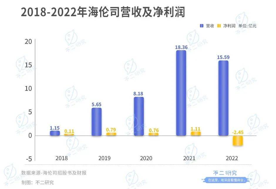 根据招股书及财报,海伦司在2018年-2022年的营收分别为1.15亿元、5.65亿元、8.18亿元、18.36亿元和15.59亿元, 2018年-2022年调整后的净利润分别为0.11亿元、0.79亿元、0.76亿元、1.11亿元和-2.45亿元。