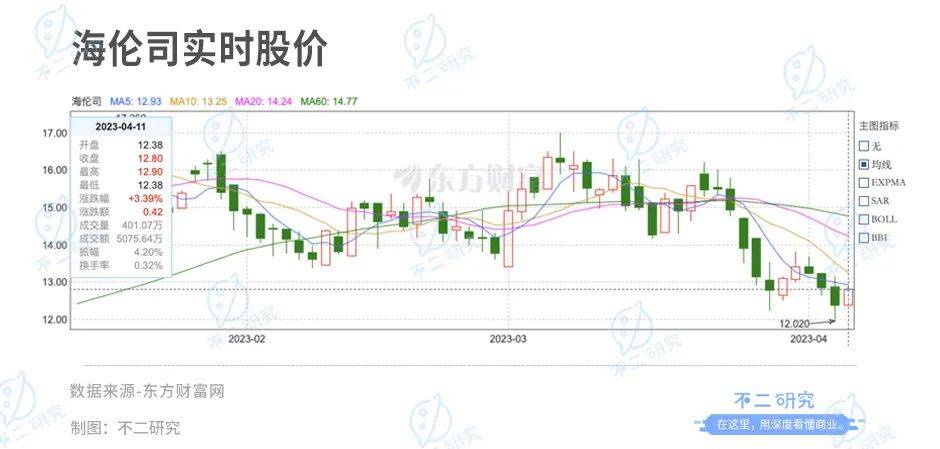 海伦司是一家连锁酒馆品牌,其年报公布后的首个交易日,其股价跌幅达6.96%。截至2023年4月11日收盘,海伦司报收12.80港元/股(折合人民币11.23亿元),对应市值162.2亿港元(折合人民币142.28亿元)。对比上市首日,其市值已跌去5成。
