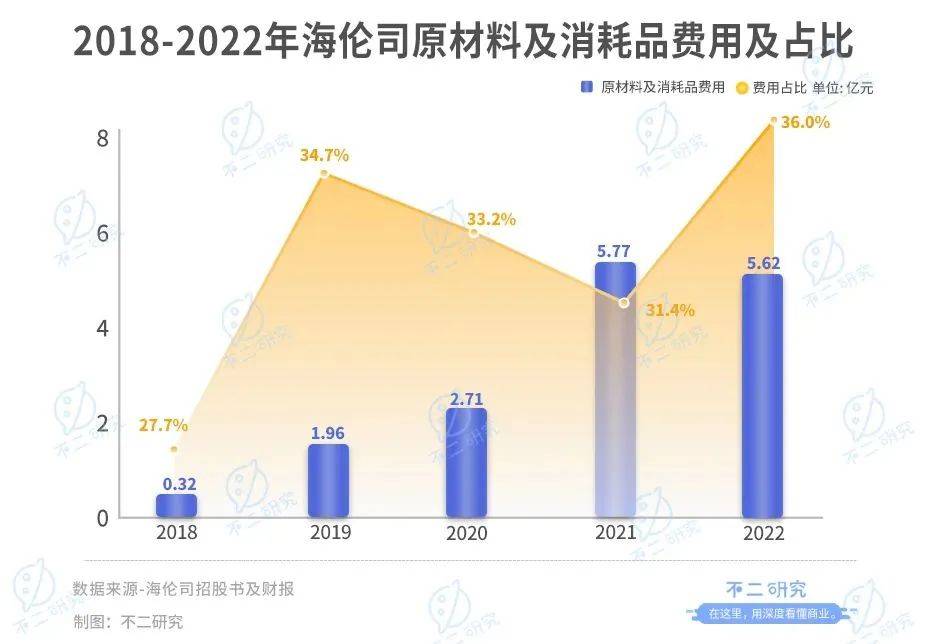 根据招股书和财报披露:2018年-2022年,海伦司原材料及消耗品分别为3170万元、1.96亿元、2.71亿元、5.77亿元和5.62亿元,同期营收占比分别为27.7%、34.7%、33.2%、31.4%和36.0%。